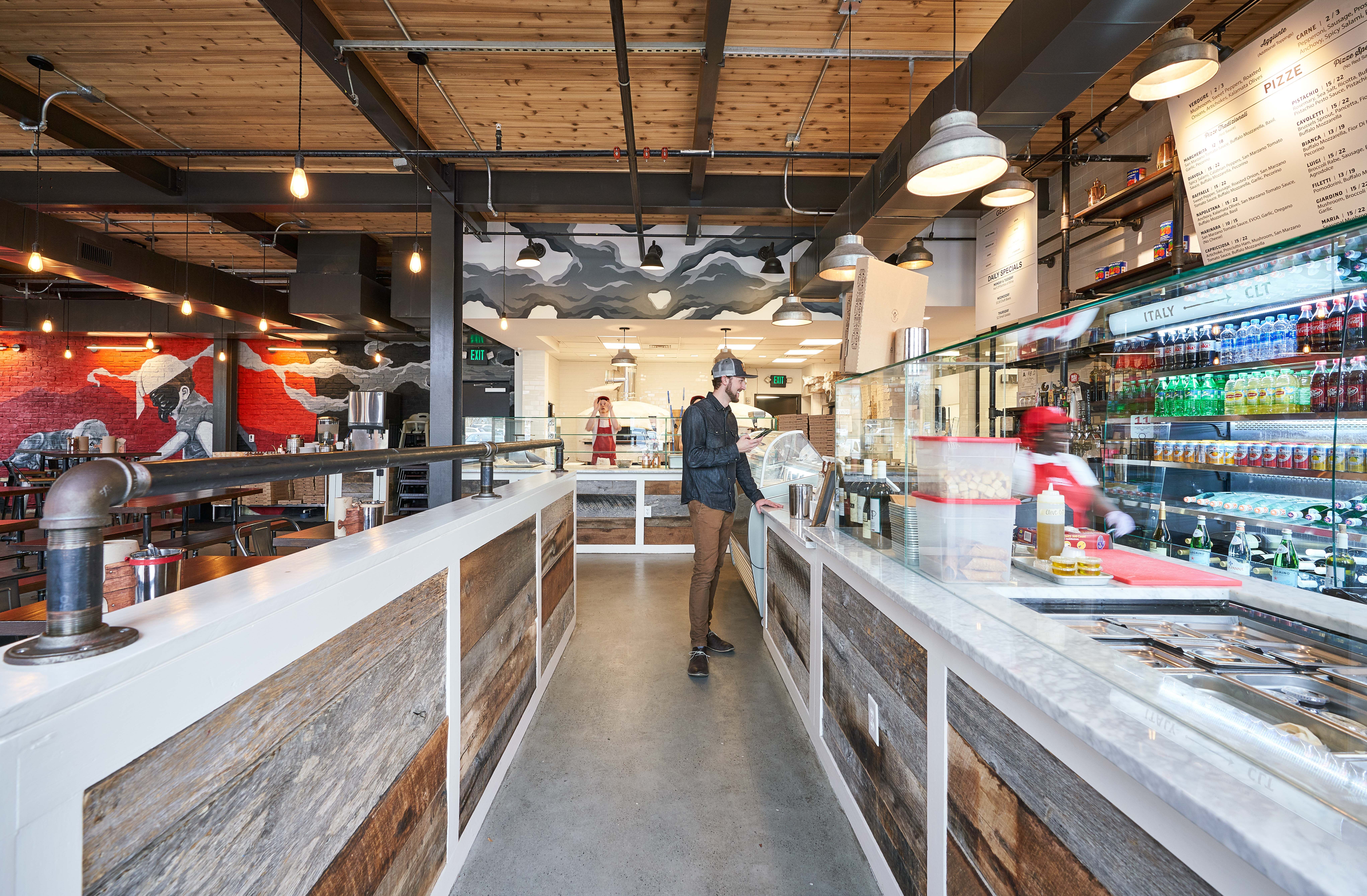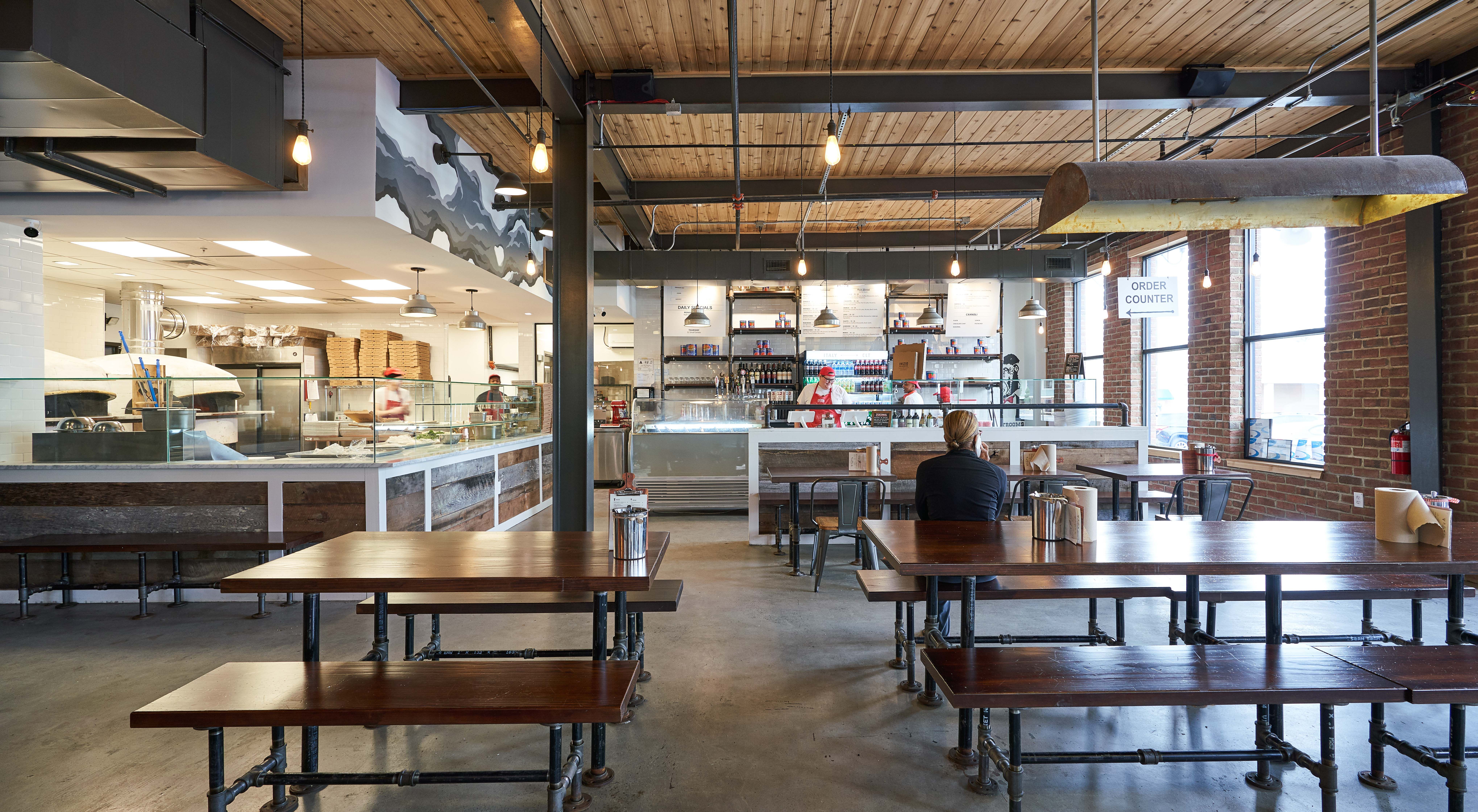The Inzio Pizza upfit is the first of two projects finished. The project is located in the Dilworth Crossing Center. The 3,000 square foot restaurant features an open air kitchen displaying two wood fired pizza ovens from Italy and a mix of modern & traditional materials including barnwood, pipe light fixtures/displays, and custom designed light fixture from local artisans.